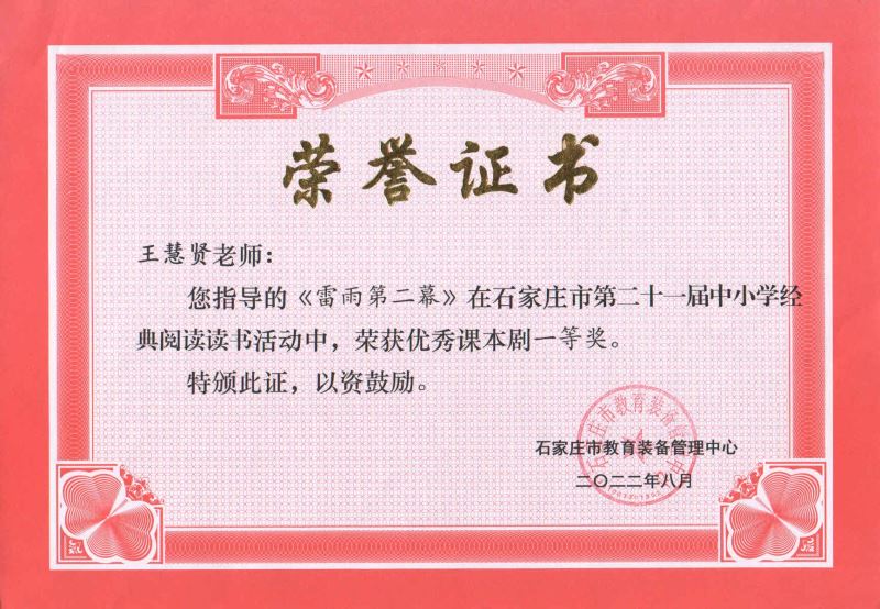 为进一步提高学生的语文学科核心素养,丰富校园文化生活,感受经典阅读的魅力,石家庄二中西校区参加了河北省和石家庄市第二十一届中小学经典阅读读书系列活动,由王慧贤老师指导、高三3班王子奇导演的课本剧《雷雨》荣获市级优秀课本剧一等奖和省级二等奖。
