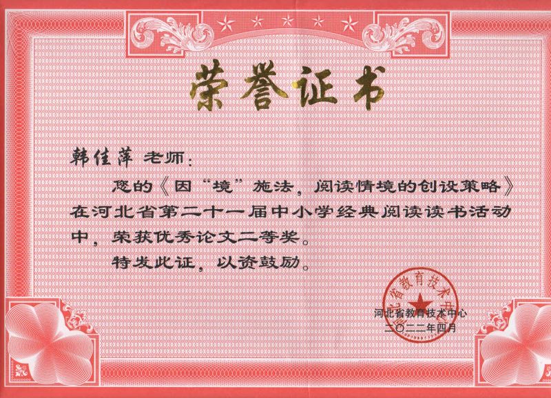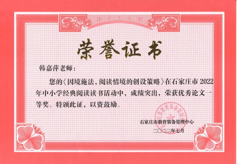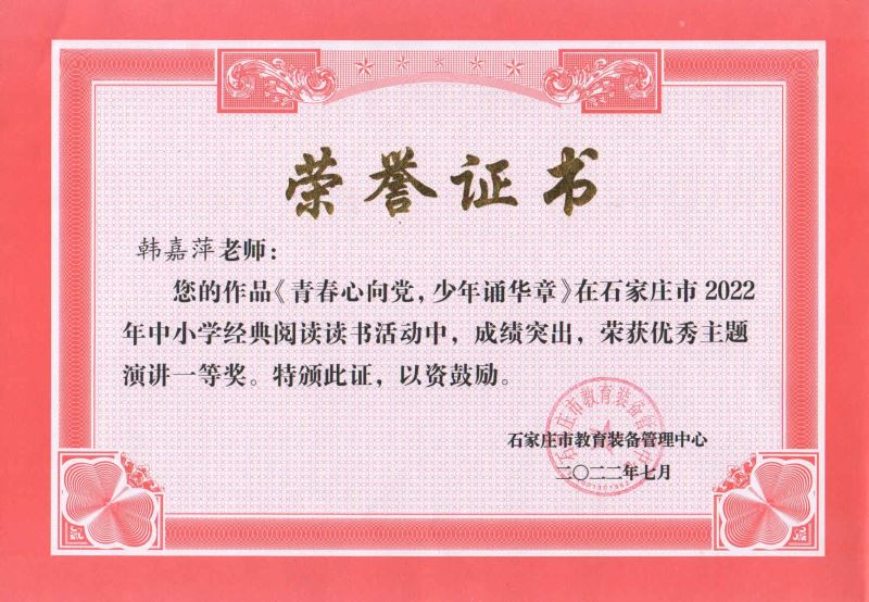 韩佳萍老师亦是硕果累累,不仅论文《因境施法,阅读情境的创设策略》分获河北省第二十一届中小学经典阅读读书活动优秀论文二等奖和石家庄市一等奖,演讲作品《青春心向党,少年颂华章》获石家庄市一等奖。
