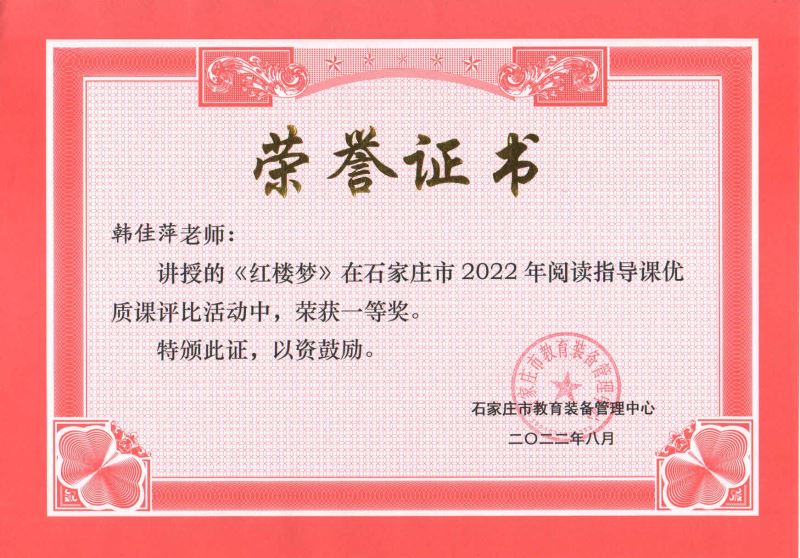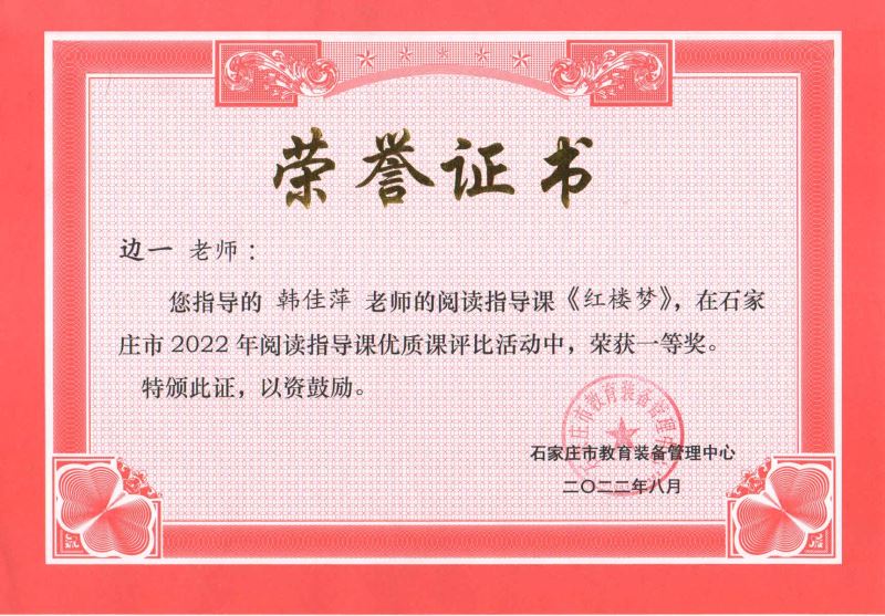 韩佳萍老师还以《红楼迷梦从何解?聚焦贾府相与析》作为《红楼梦》整本书阅读大单元教学的起始课,引导学生在整本书阅读中学会借助多元视角,审视贾府中的人、事、物,进而体悟作者精巧的构思,激发学生的阅读兴趣。在石家庄市2022年阅读指导课优质课评比中荣获一等奖,边一老师同时荣获指导奖。