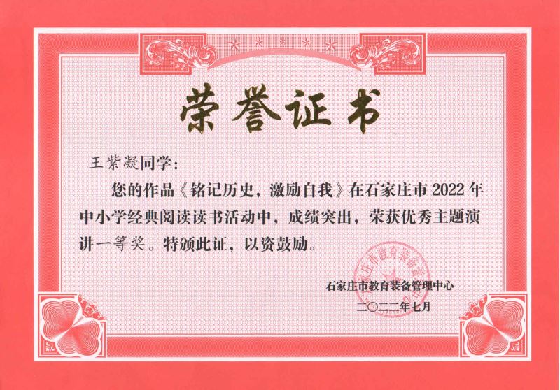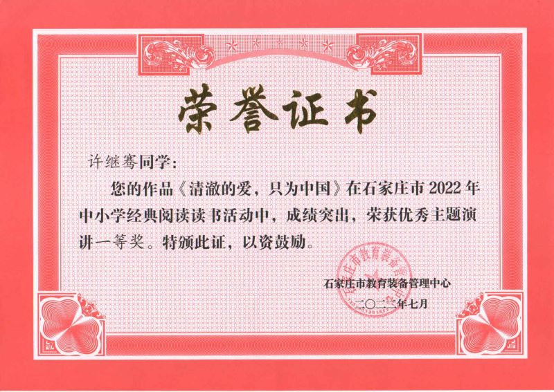许继骞同学也在石家庄市2022年中小学经典阅读读书活动中以作品《清澈的爱,只为中国》荣获优秀主题演讲一等奖的好成绩,一起为学校增光添彩。