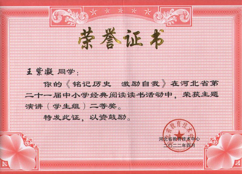 王紫凝同学演讲作品《铭记历史,激励自我》分获第二十一届中小学经典阅读读书活动和“青春心向党 少年颂华章”读书活动两个河北省二等奖和石家庄市一等奖。