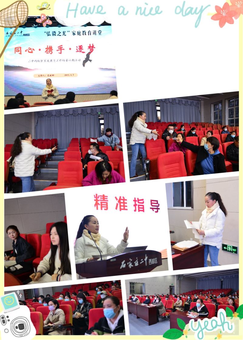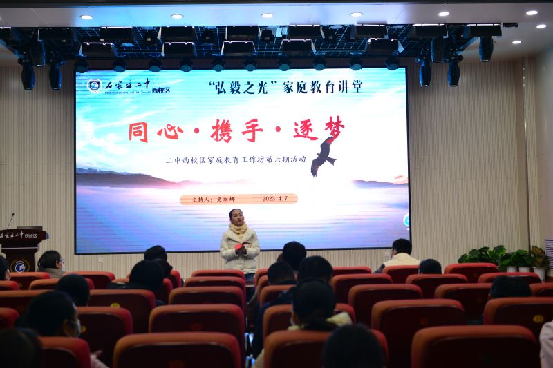 父母的言行是孩子成长的航标,家人的关爱是孩子成长的温床,家庭的和谐是孩子成长的阳光。为了充分发挥家校协同育人的力量,进一步提升家长的家庭教育能力水平,更好地肩负起培养德智体美劳全面发展的时代新人的重任,4月7日晚7点,石家庄二中西校区组织初二年级学生和家长在知源楼报告厅开展了以“同心·携手·逐梦”为主题的家庭教育讲堂活动,这也是家庭教育工作坊的第6期活动活动由初中部主任史丽娜主持并主讲,。