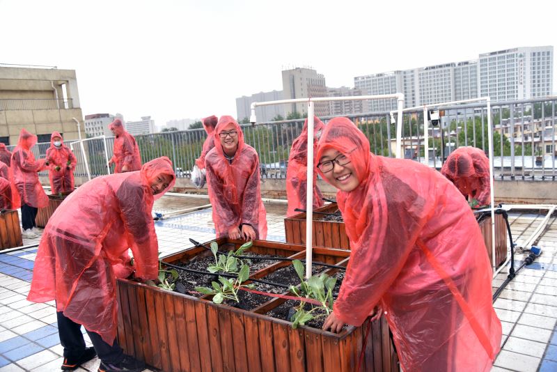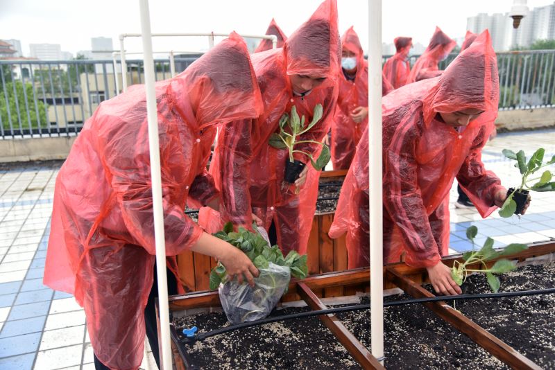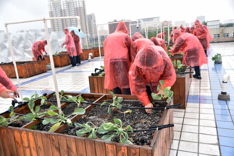 随后在知源楼六楼天台劳动教育实践基地各班分组种植,老师指挥,按照要求操作。