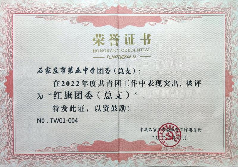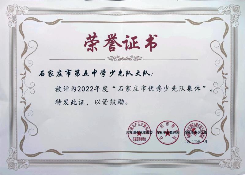 近期,石家庄二中西校区团委被中共石家庄市委教育工委评为2022年度“红旗团委”,同时少先队大队被团市委、市教育局、市少工委评为2022年度“优秀少先队集体”。