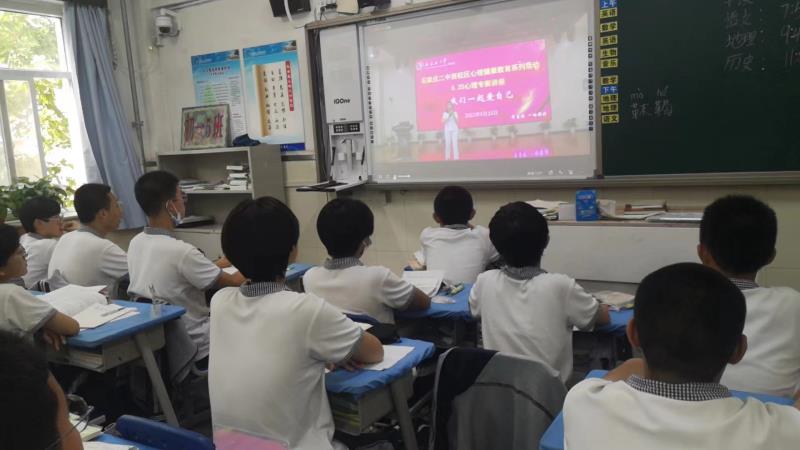 石家庄二中西校区利用25、26两天下午,特邀河北省中医学院资深心理咨询专家刘珈宇教授分别为初、高中学生举办了主题为“我们一起爱自己”的心理健康专家讲座,讲座采用线上线下相结合的方式,张永泽副校长主持了讲座活动。
