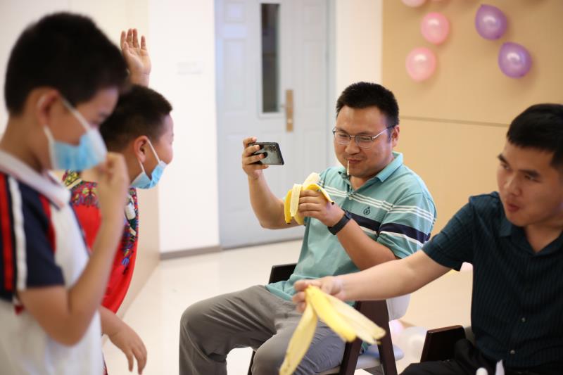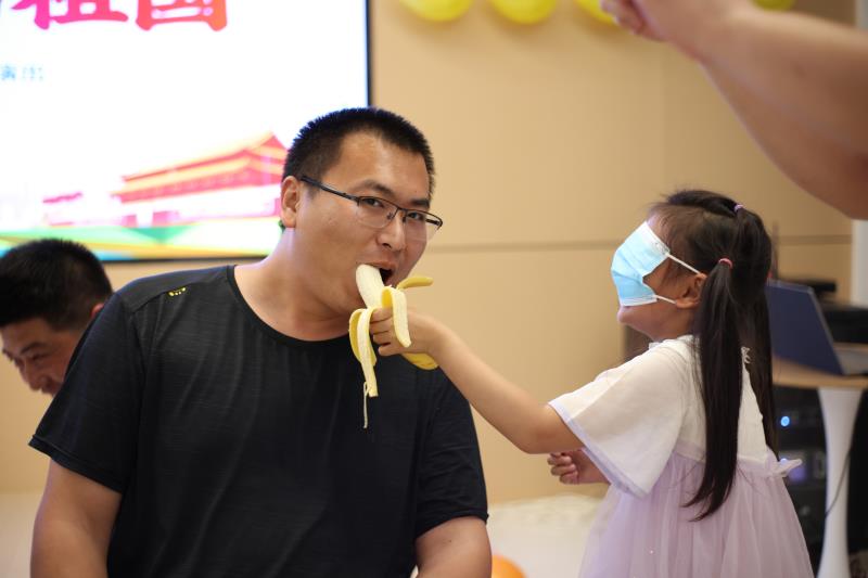 在亲子互动环节,教工家长和孩子们一起参加蒙眼吃香蕉等游戏,现场气氛热烈,笑声不断。
