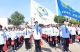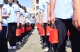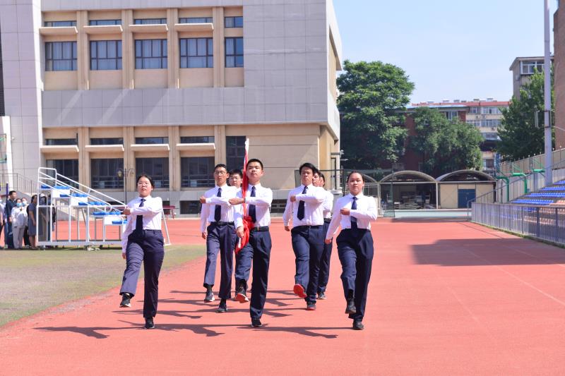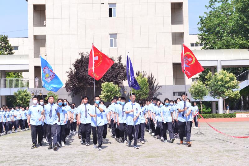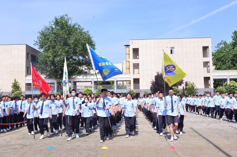 激昂的乐曲声中,全校师生的壮行口号响彻云霄:“高三加油”、“高考必胜”,高三学子昂首阔步,在“我