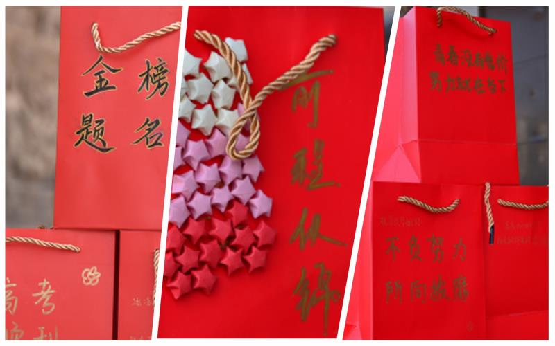 心想“柿”成,必定“糕粽”!一个个高考“锦囊”红火喜庆,在红色锦囊上学弟学妹们写满了吉语祝福,