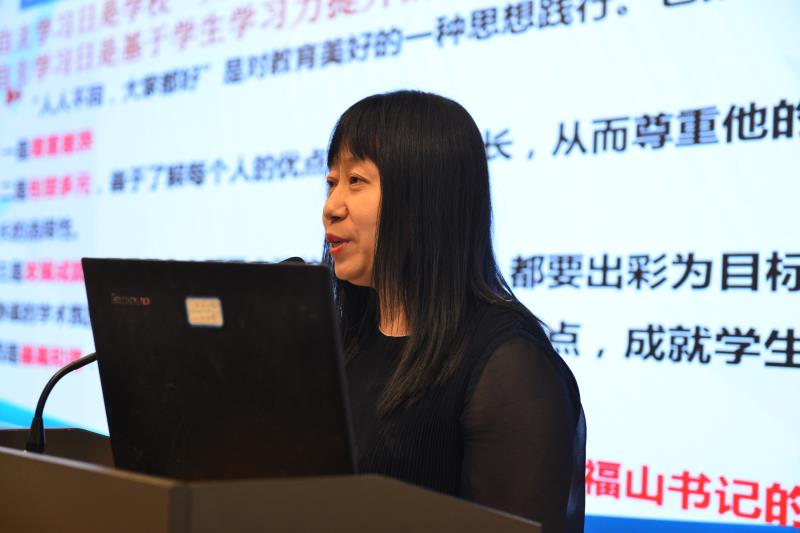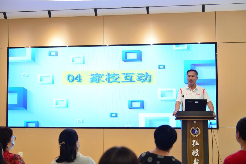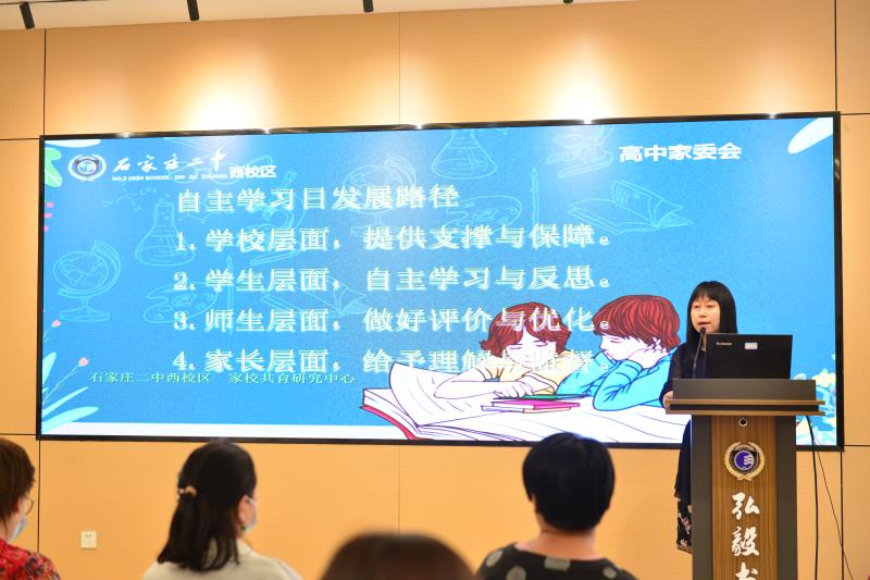 家校共育研究中心王润萍主任首先开讲,目前高二年级每周一日的自主学习,是给学生学习选择权,培养其自学能力,是学校“人人不同,大家都好” 思想理念的具体落地,更是从尊重差异、包容多元、发展成就、善美和谐四个方面对教育的探索实践。