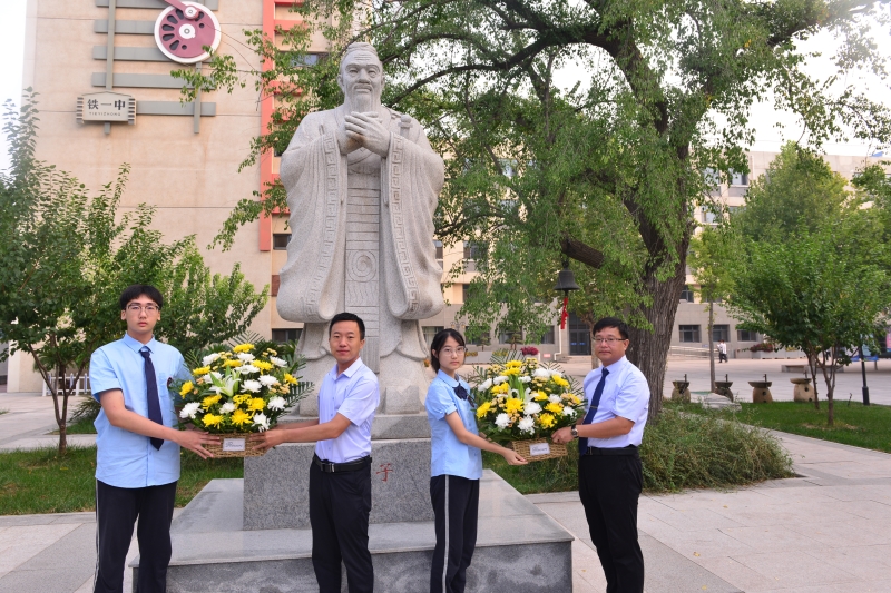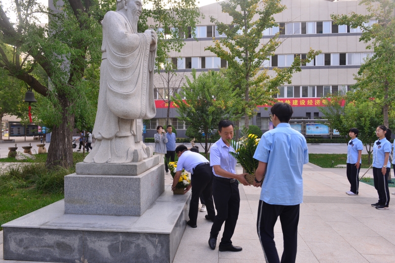 晨阳初映,教育处刘建炜主任、邢玉彬、吴世杰副主任及杨雅杰、杨若琳老师带领高一部分同学齐聚广场,向伟大的思想家、教育家、至圣先师献上花篮。