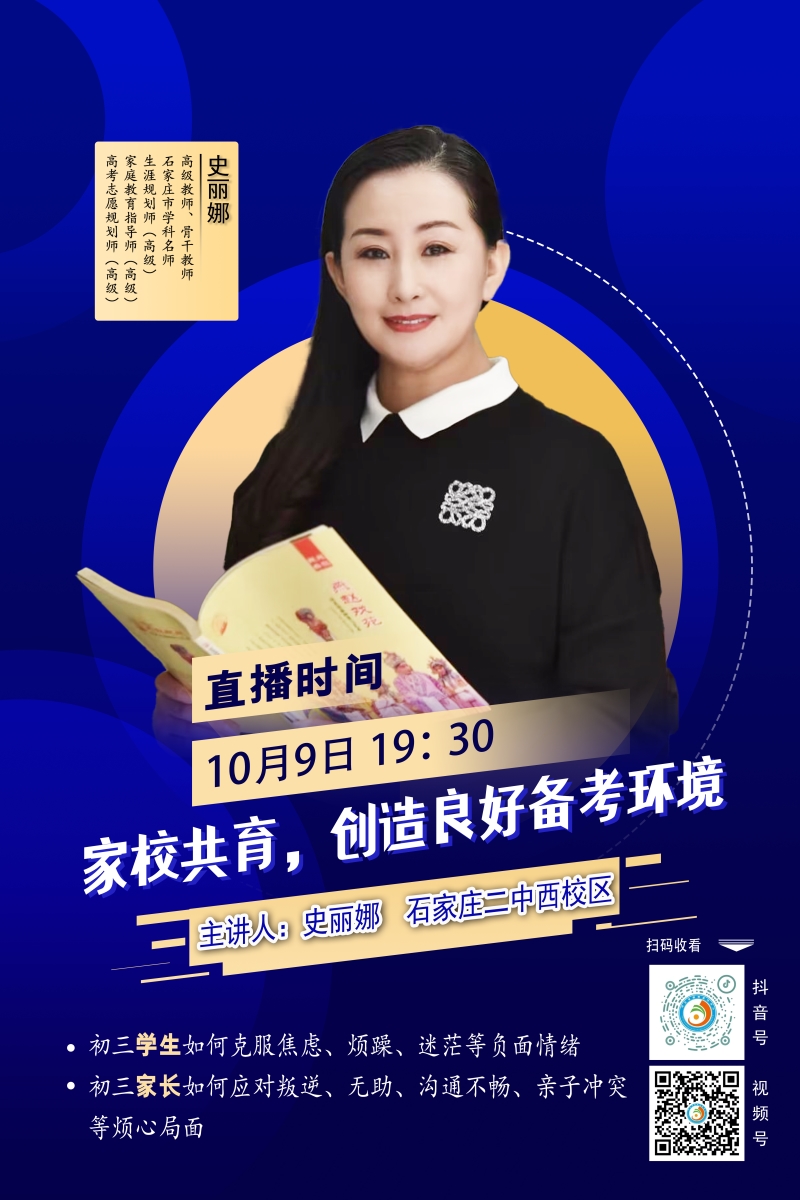 别急!石家庄二中西校区初中部主任史丽娜老师将做客河北省教育宣传中心“冀教新视界”直播间为你答疑解惑。通过她专业的讲解和案例分析,让初三学生轻装上阵,让家长朋友拨云见日,从而进一步促进家校合作,共同构建和谐的学习环境。