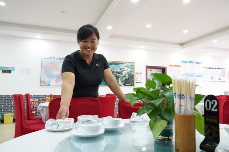 石家庄平山县西柏坡镇西柏坡村村民齐红宝在经营的酒店里摆放餐具(2023年10月18日)。新华社记者 朱旭东 摄