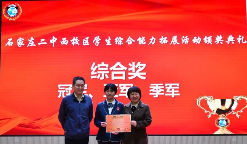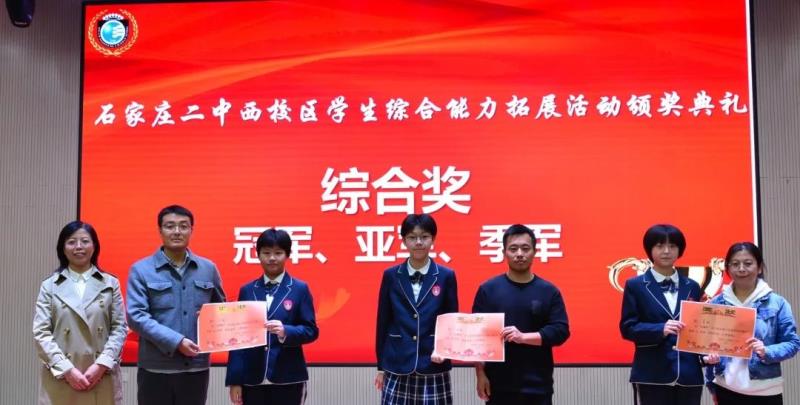 李建鹏副校长、屈兴昌助理、常乐主任为初二年级综合成绩冠、亚、季军颁奖