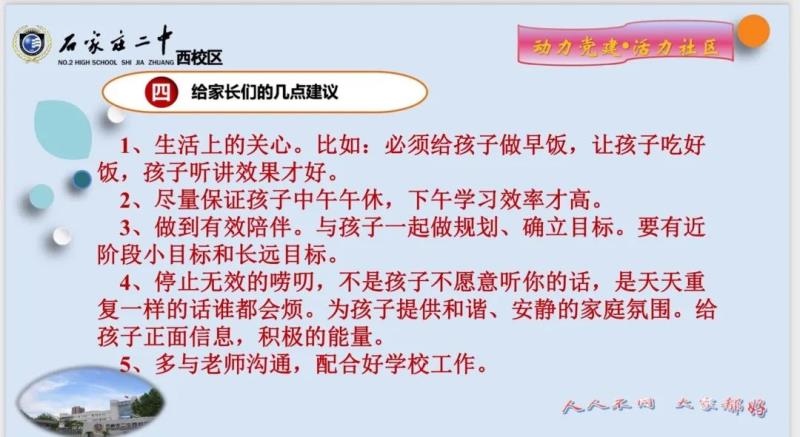激发党建活力,共建活力社区。下一步,石家庄二中西校区将继续充分发挥党建引领基层服务效能,持续提升基层服务水平和为民服务能力,积极探索创新服务管理模式,不断探索多元参与的教育服务工作新格局。