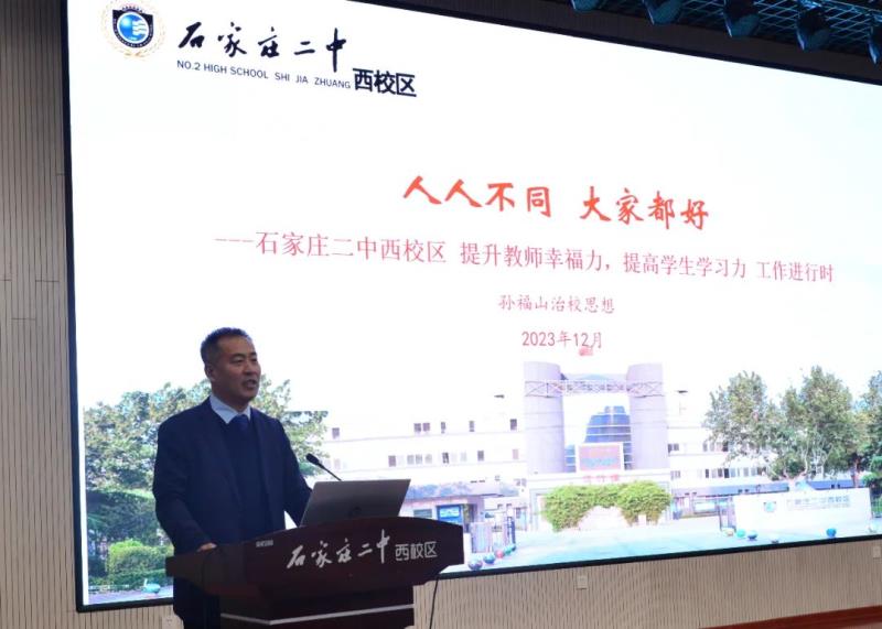 之后在报告厅进行了一系列主题报告,首先由孙福山书记做了关于《人人不同,大家都好---石家庄二中西校区提升教师幸福力,提高学生学习力工作进行时》的主题报告。孙书记从思源、思涵、思行、思远四个方面介绍了他的治学思想,学校秉承教育集团“学生好,一切都好”的办学理念,践行着“人人不同,大家都好”的行动哲学,发扬“弘毅”精神,分别在尊重差异,包容多元,发展成就,善美和谐等方面做了详细阐述,阐述了学校的价值,追求定位,战略规划以及家校情怀。使大家感受颇深,感到了前所未有的工作责任和使命。