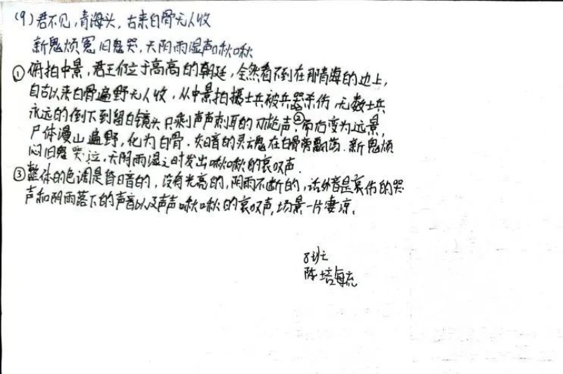 以诗歌为蓝本撰写纪录片拍摄脚本的活动,是一个引导学生在创作中感悟情绪,体会乐趣的契机。学生拟写视频拍摄脚本的过程,实则是一个构思、联想并运用语言进行表达的过程。将自己的所见、所闻、所思、所感浓缩在一个个镜头、一幅幅画面中,在独特的构思下比如“特写”,会生成特殊的的拍景手法,如“长镜头”或“蒙太奇”,而这些特殊的镜头背后,恰是古代诗人灵魂和精神的袒露,是学生和诗歌情感的共通共融。接下来让我们一起欣赏同学们《兵车行》拍摄脚本的佳作吧!