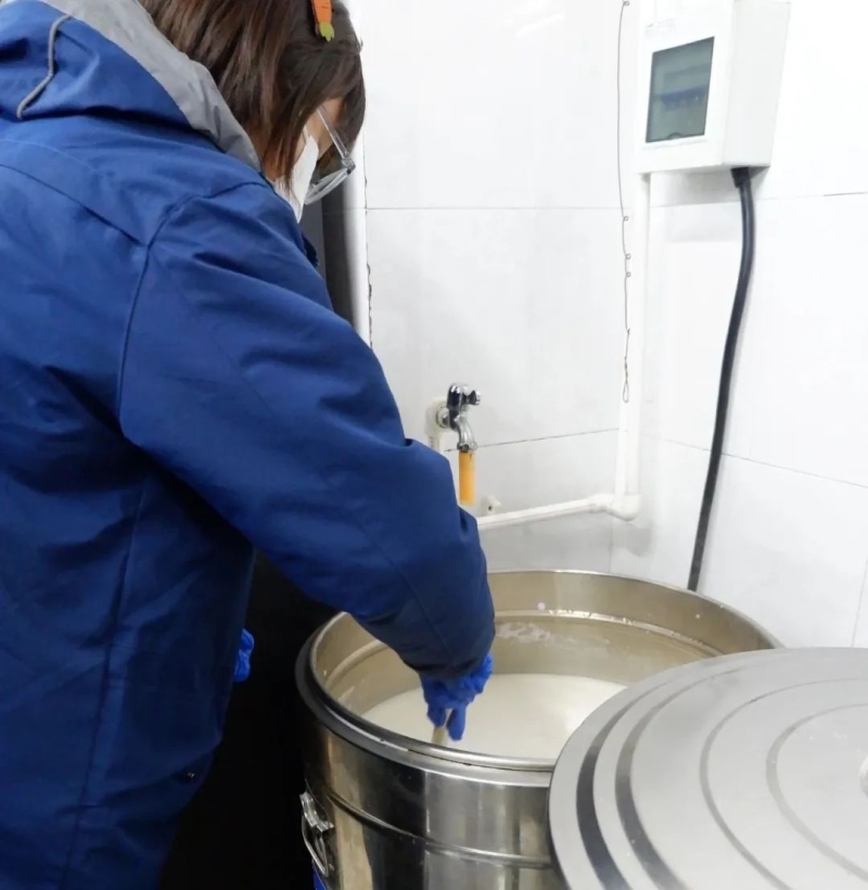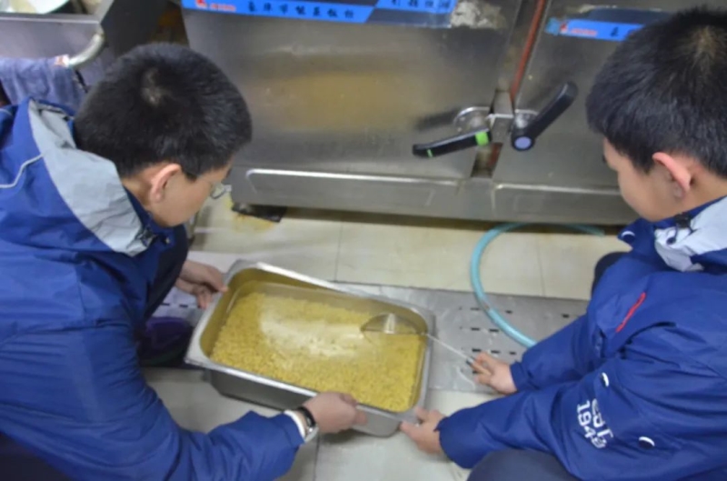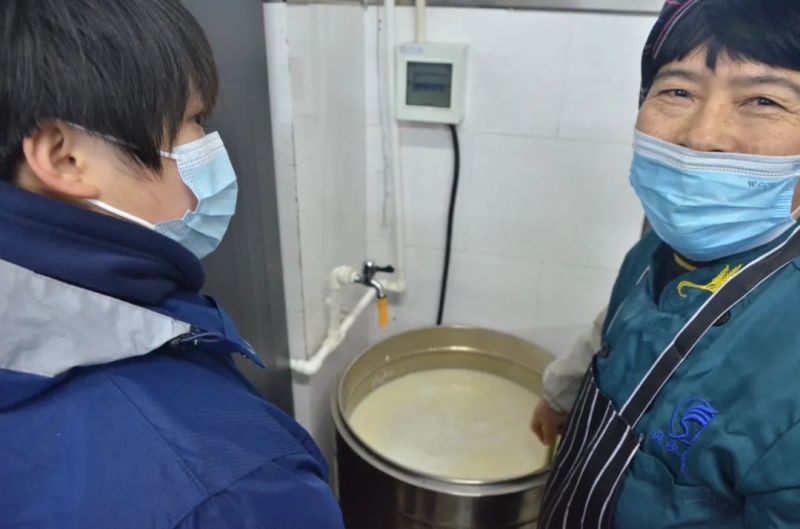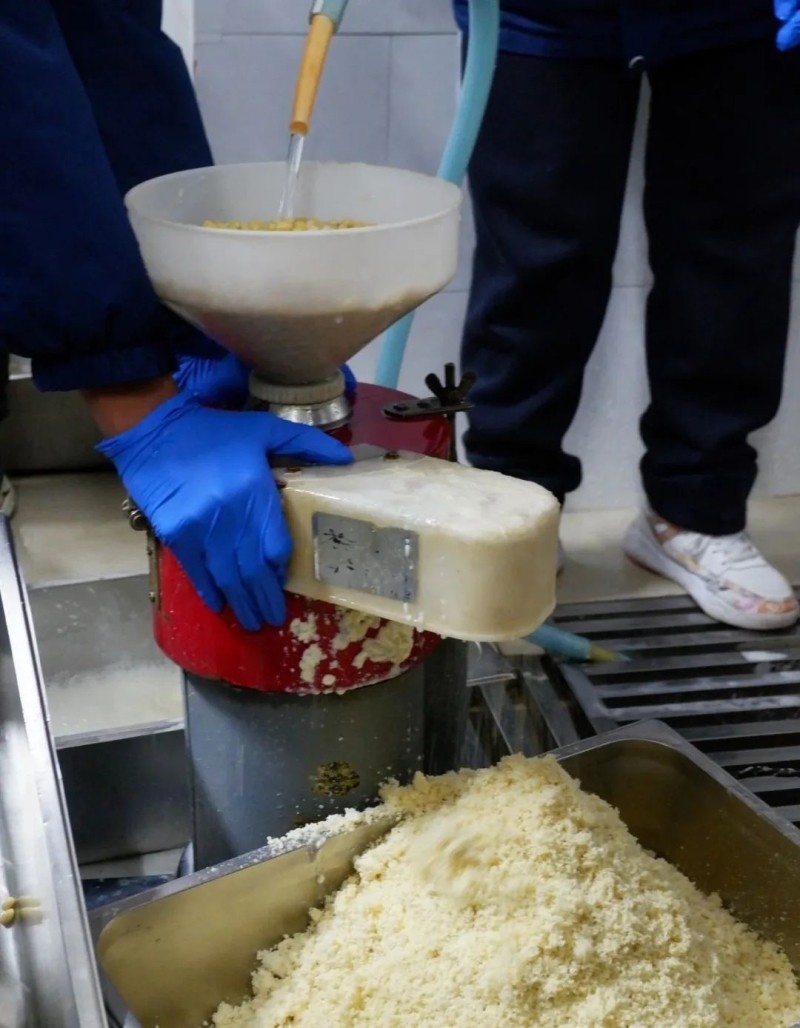 5:15志愿者们在学校中餐厅向食堂师傅们取经学习如何制作豆浆。
