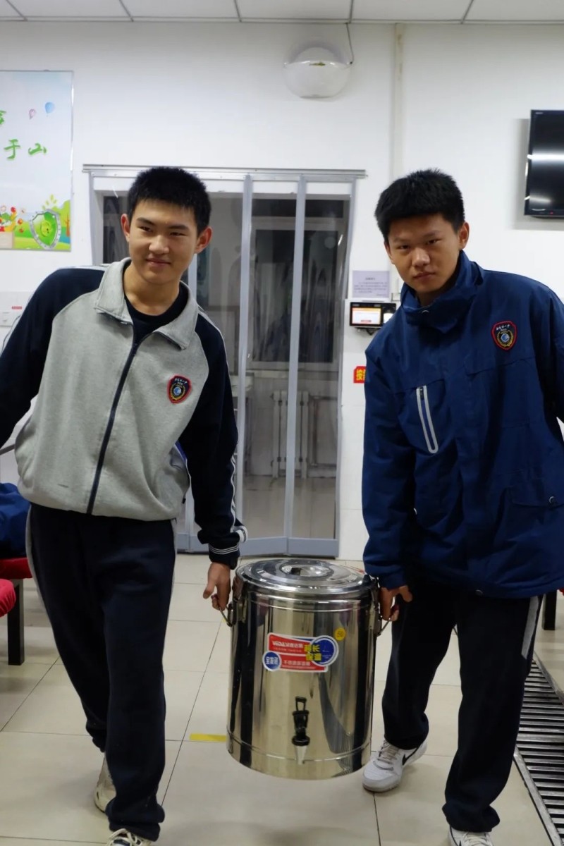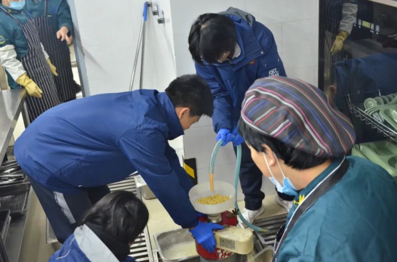 2023年12月22日凌晨五点,石家庄二中西校区教育科刘建炜主任、吴世杰副主任和杨雅杰老师一同带领青年志愿者协会的10名同学早早赶到食堂来制作豆浆。志愿者们要将亲手制作的豆浆送给我们城市的美容师---环卫工人。