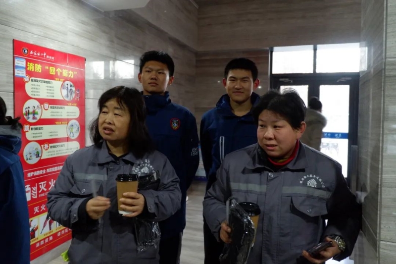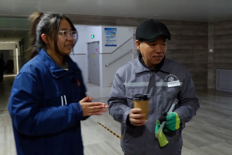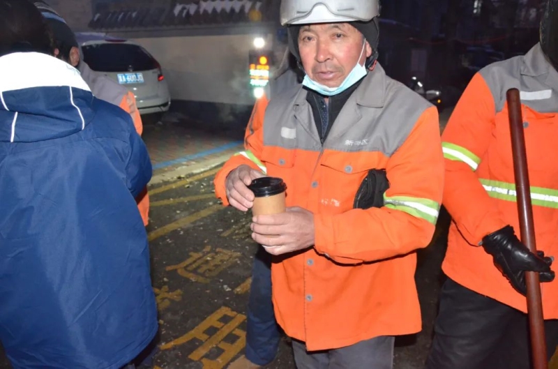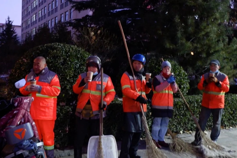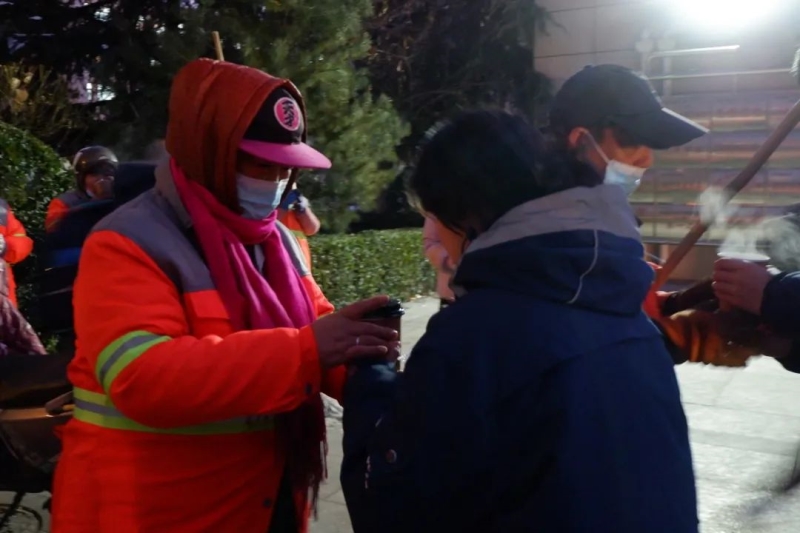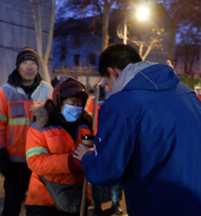 返回学校志愿者们也向校园保洁和后勤师傅送上热乎乎的豆浆和滑雪手套。