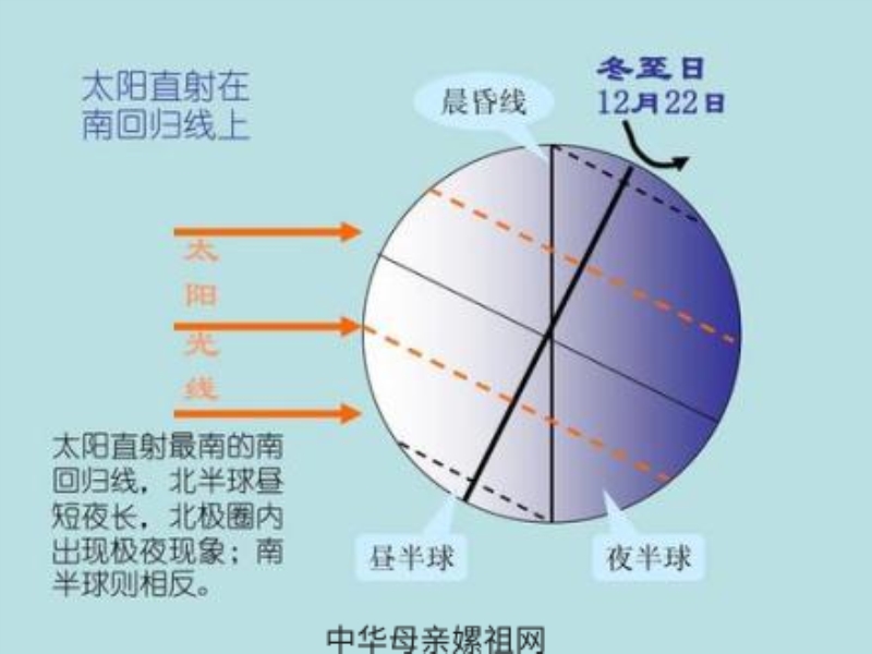冬至是“二十四节气”之第22个节气,于每年公历12月21-23日交节。冬至是太阳直射点南行的极致,冬至这天太阳光直射南回归线,太阳光对北半球最为倾斜,太阳高度角最小,是北半球各地白昼最短、黑夜最长的一天。冬至也是太阳直射点北返的转折点,这天过后它将走“回头路”,太阳直射点开始从南回归线向北移动,北半球白昼将会逐日增长。