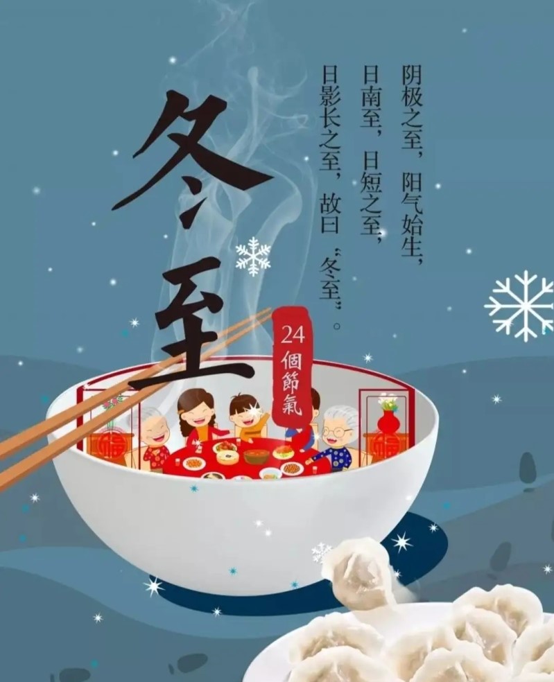 冬至,又称日南至、冬节、亚岁等,兼具自然与人文两大内涵,既是二十四节气中一个重要的节气,也是中国民间的传统祭祖节日。冬至是四时八节之一,被视为冬季的大节日,在古代民间有“冬至大如年”的讲法。冬至习俗因地域不同而又存在着习俗内容或细节上的差异。在中国南方地区,有冬至祭祖、宴饮的习俗。在中国北方地区,每年冬至日有吃饺子的习俗。