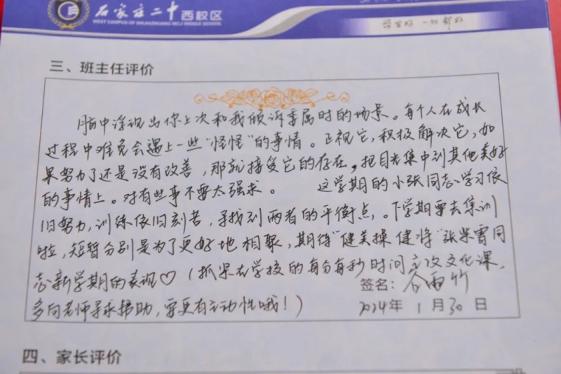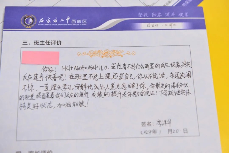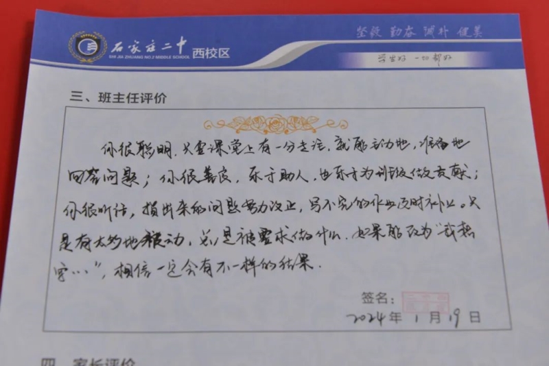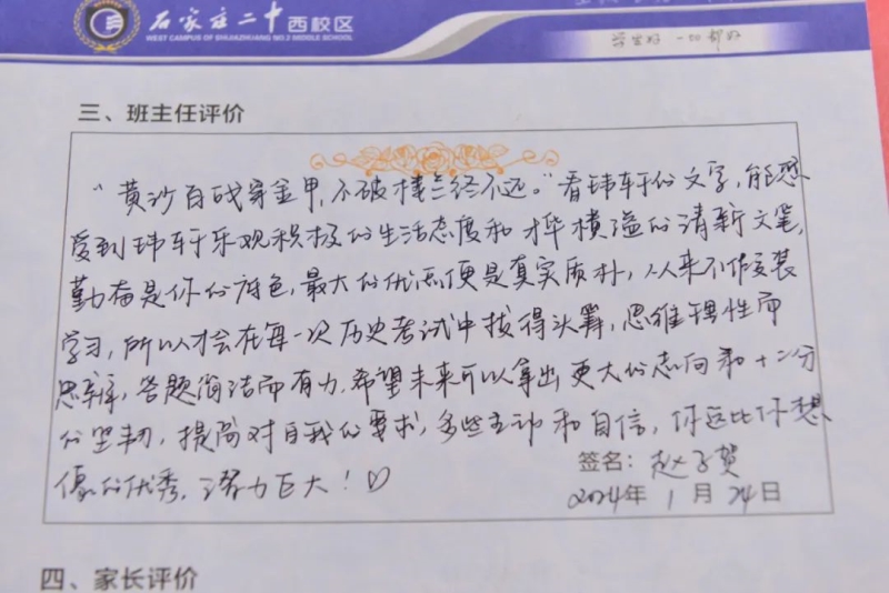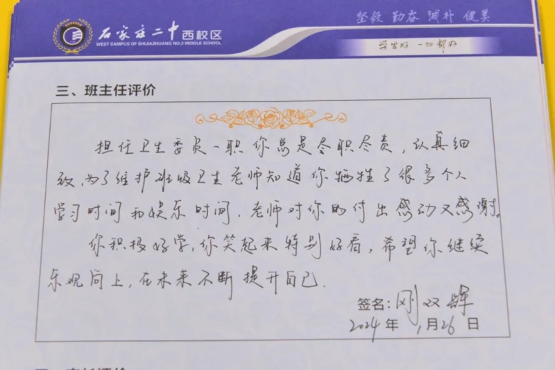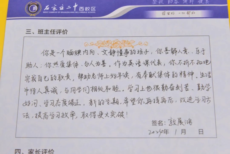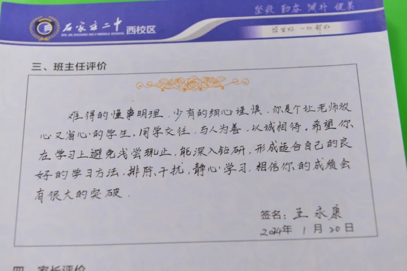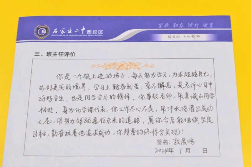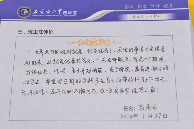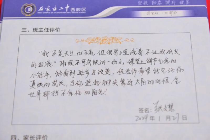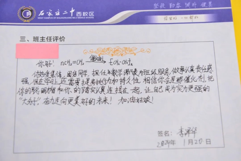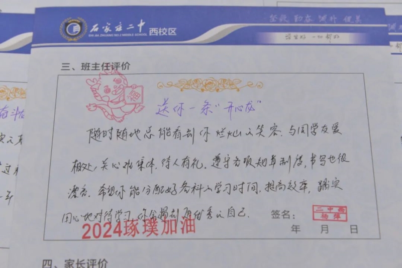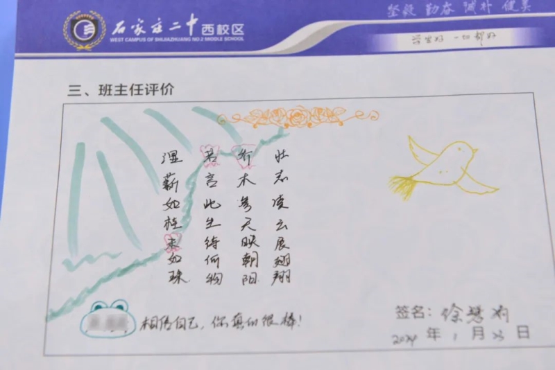 “刘家有女才貌全,妮似仙子下尘凡”、“杨柳依依醉流连,雅韵袅袅贺生天”......这些朗朗上口的诗句,是石家庄二中西校区学生收到的专属定制礼物——期末班主任评语。