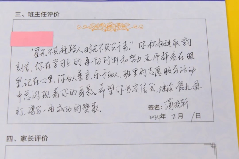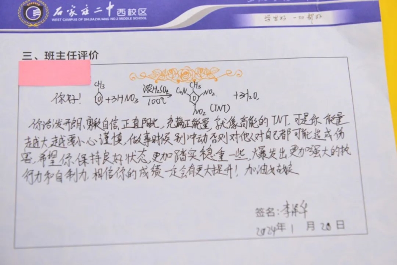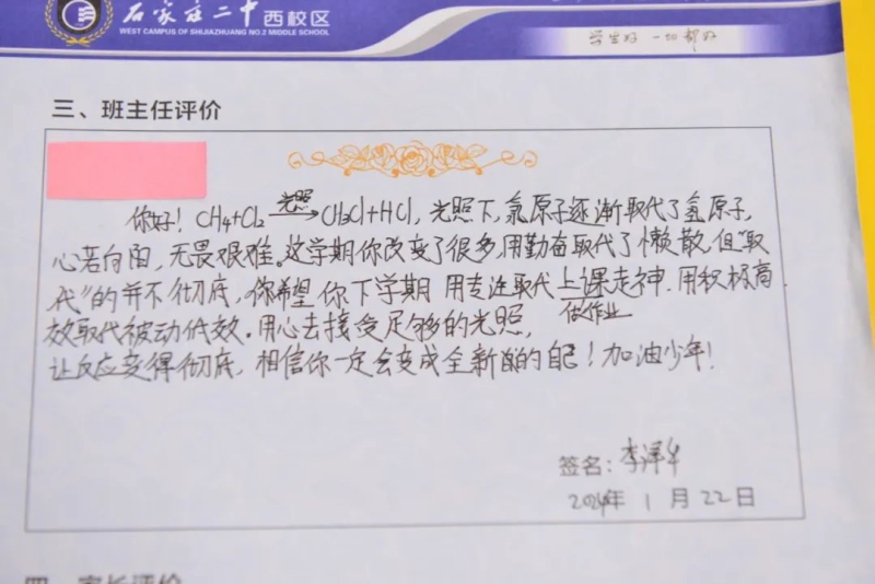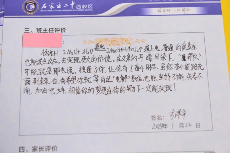 润物细无声,一字一句总关情!老师们在撰写风格上不断创新、在内容上不断丰富。藏头诗带来的温暖、化学方程式蕴含的惊喜,鼓励着学生们心向阳光,恣意生长。这些评语,或感情真挚、文采斐然,或个性鲜明、形式新颖,或文字质朴、深沉含蓄......充分展示了班主任工作的细致性、科学性和艺术性。