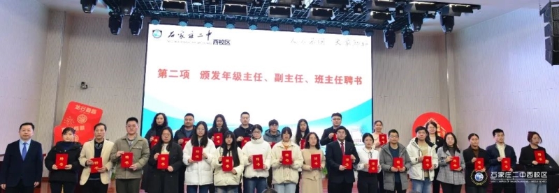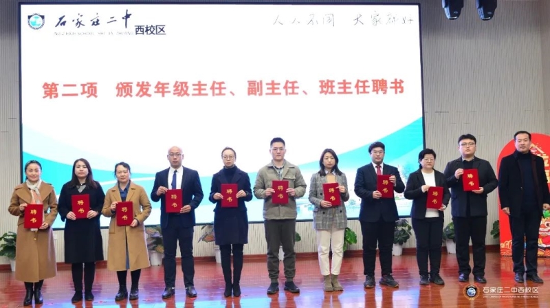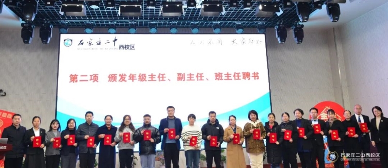 第二项,颁发年级主任、副主任、班主任聘书。校领导为各年级的一线教师管理队伍颁发聘书,一纸聘书,一份责任,更是一种信赖和期待。希望全体年级主任、副主任、班主任在新学期以更加昂扬的精神,践行学校人人不同大家都好的发展理念,为二西高质量发展贡献智慧和力量。