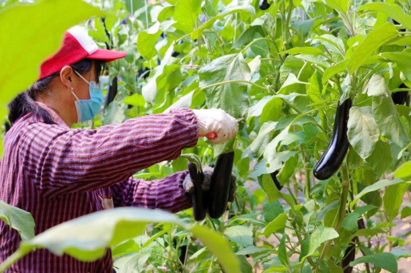 村民正在位于冀州区东罗口村的北京新发地果蔬驿站示范园区采摘茄子。新华社记者任丽颖 摄